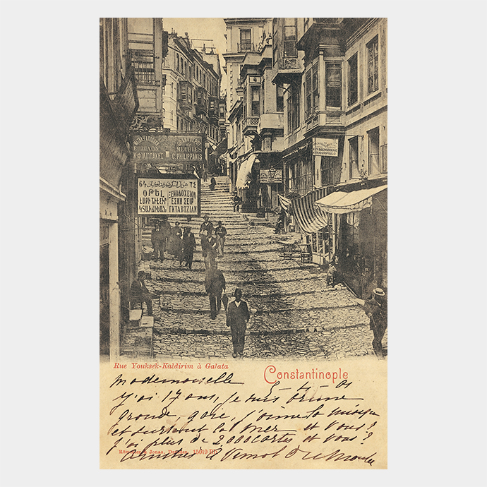 İstanbul’da Galata’dan Pera’ya çıkan Yüksek Kaldırım Sokağı’nda çok dilli tabelalar. Osmanlıca, Ermenice ve Rumca yazılı olan soldaki tabela Gıdavcıyan soyadlı bir Ermeni’nin Eskişehir Oteli’ne; Osmanlıca, Rumca, Fransızca yazılı olan üstteki tabela K. Flipakis adlı bir Rum’un mobilya mağazasına; Osmanlıca, Rumca, Ermenice, Fransızca yazılı olan sağ arkadaki tabela Hacı Tovmas adlı bir Ermeni’nin İzmit Oteli’ne; Osmanlıca, Fransızca, Rumca yazılı olan en sağdaki tabela Kiryaki Vosnopulos adlı bir Rum’un işletmesine ait. Kartpostal 2.000’den fazla kartpostalının bulundu¤unu belirten bir kişi tarafından 9 Nisan 1901 tarihinde kart değiştokuşu amacıyla Paris’e yollanmış.