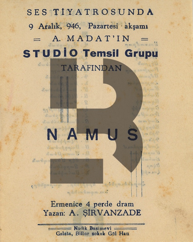Şirvanzade'nin Namusu adlı 4 perdelik dram oyununun, Aşod Madat'ın Studio Temsil grubu tarafından 9 Aralık 1946, İstanbul Ses Tiyatrosu'nda sergilenmesi için yapılmış katlı broşürüdür, 2'ye katlamalı, iki yönü be basılıdır,