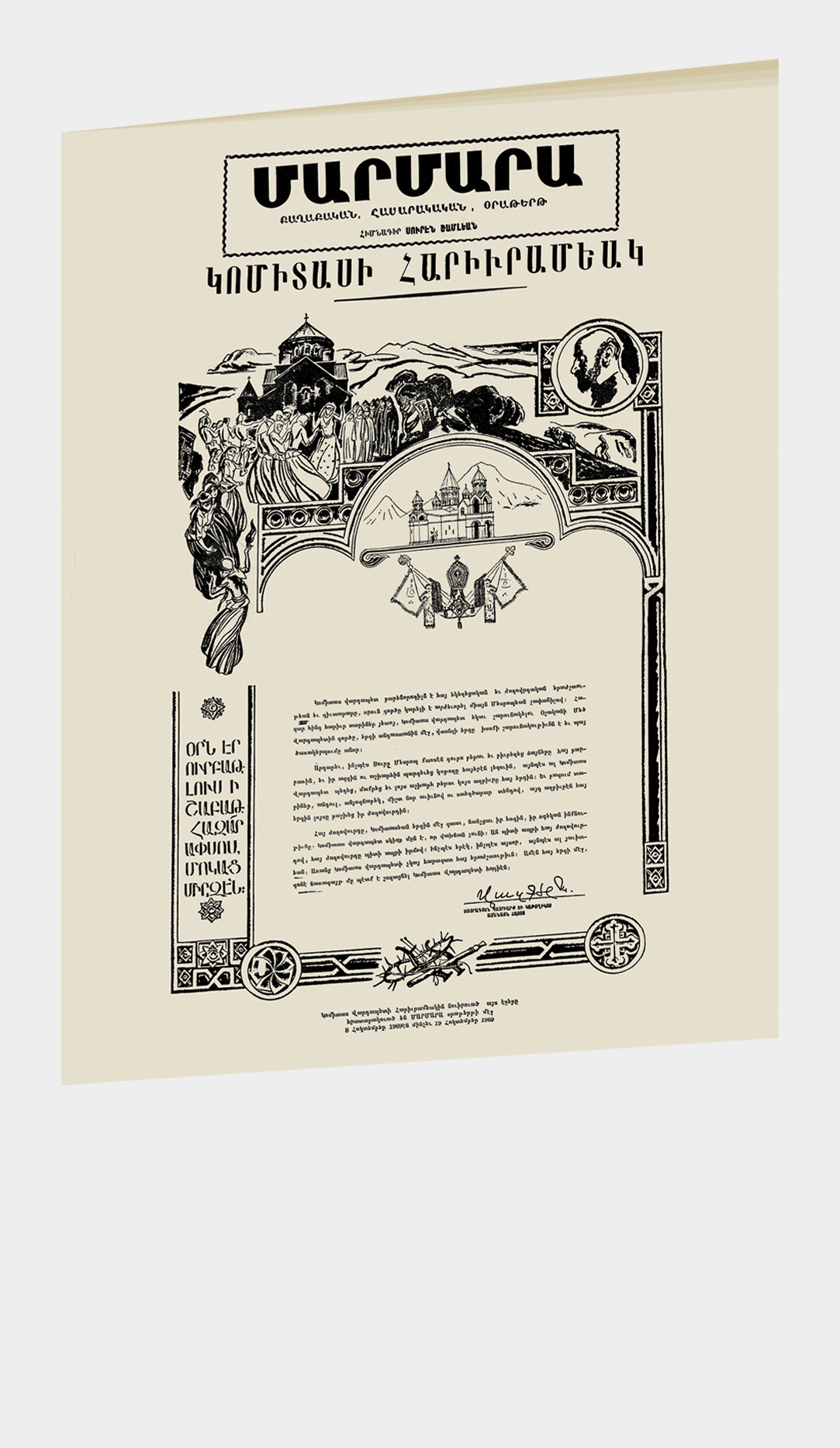 Bu yayın, Ermeni müzikolog, besteci, derlemeci Gomidas Vartabed’in doğumunun 100. yılı olan 1969’da Marmara gazetesinin yaptığı özel yayının 50 yıl sonra Türkçe açıklamalar eklenmiş tıpkıbasımıdır. Orijinali Calumeno Ailesi Koleksiyonu’nda bulunan yayın, gazete boyutunda (41x57 cm), 2. ve 16. sayfası boş olmak üzere 16 sayfadır. Aslında orijinal yayının kendisi de Marmara gazetesinin 8 Ekim - 19 Ekim 1969 tarihli sayılarında yer almış olan sayfaların bir araya getirilerek yeniden basımından oluşmuştur. Marmara gazetesi, daha sonra aldığı isimle Nor Marmara, 1940 yılında Suren Şamlıyan tarafından kurulmuş, 1967 yılından itibaren Rober Haddeciyan tarafından yönetilmektedir.