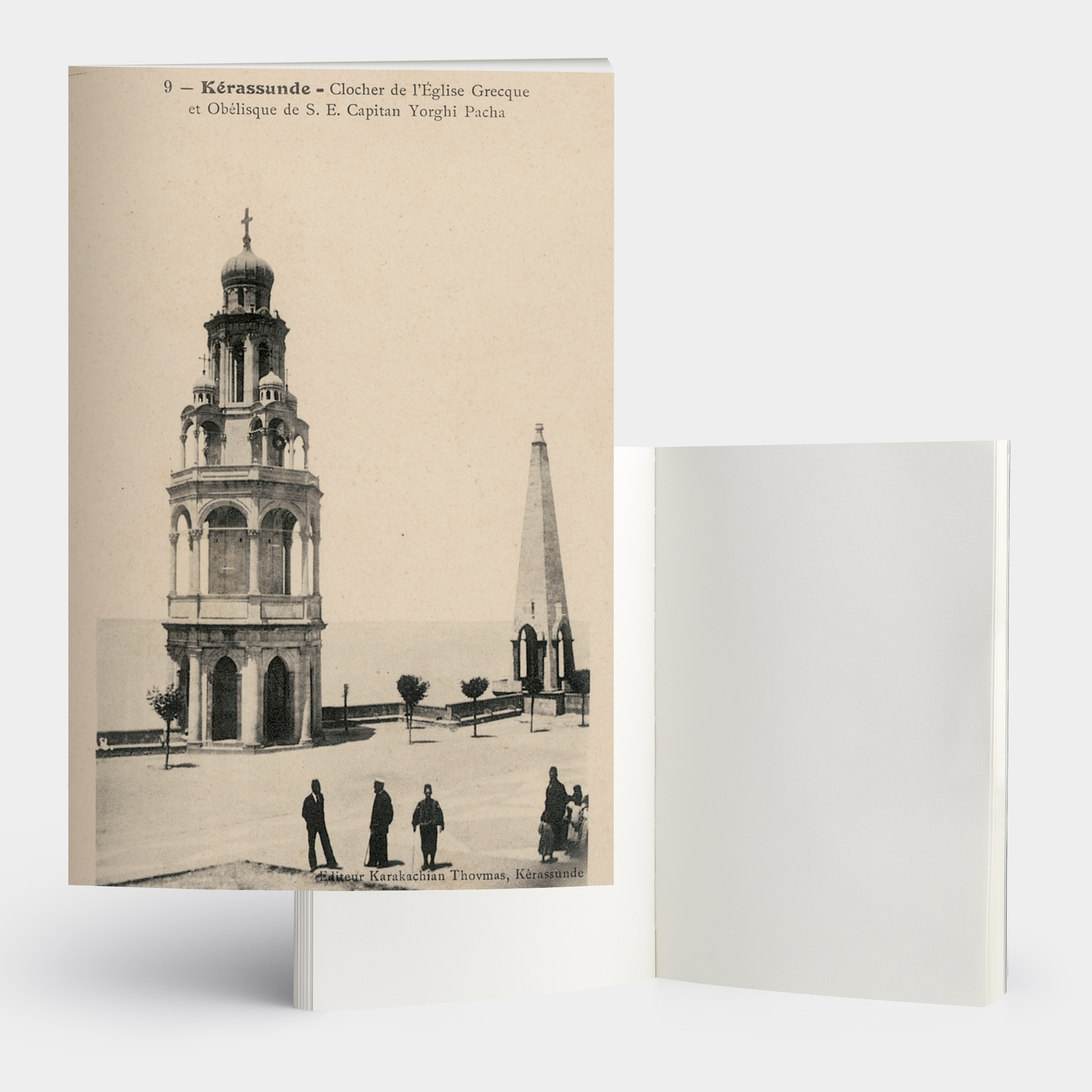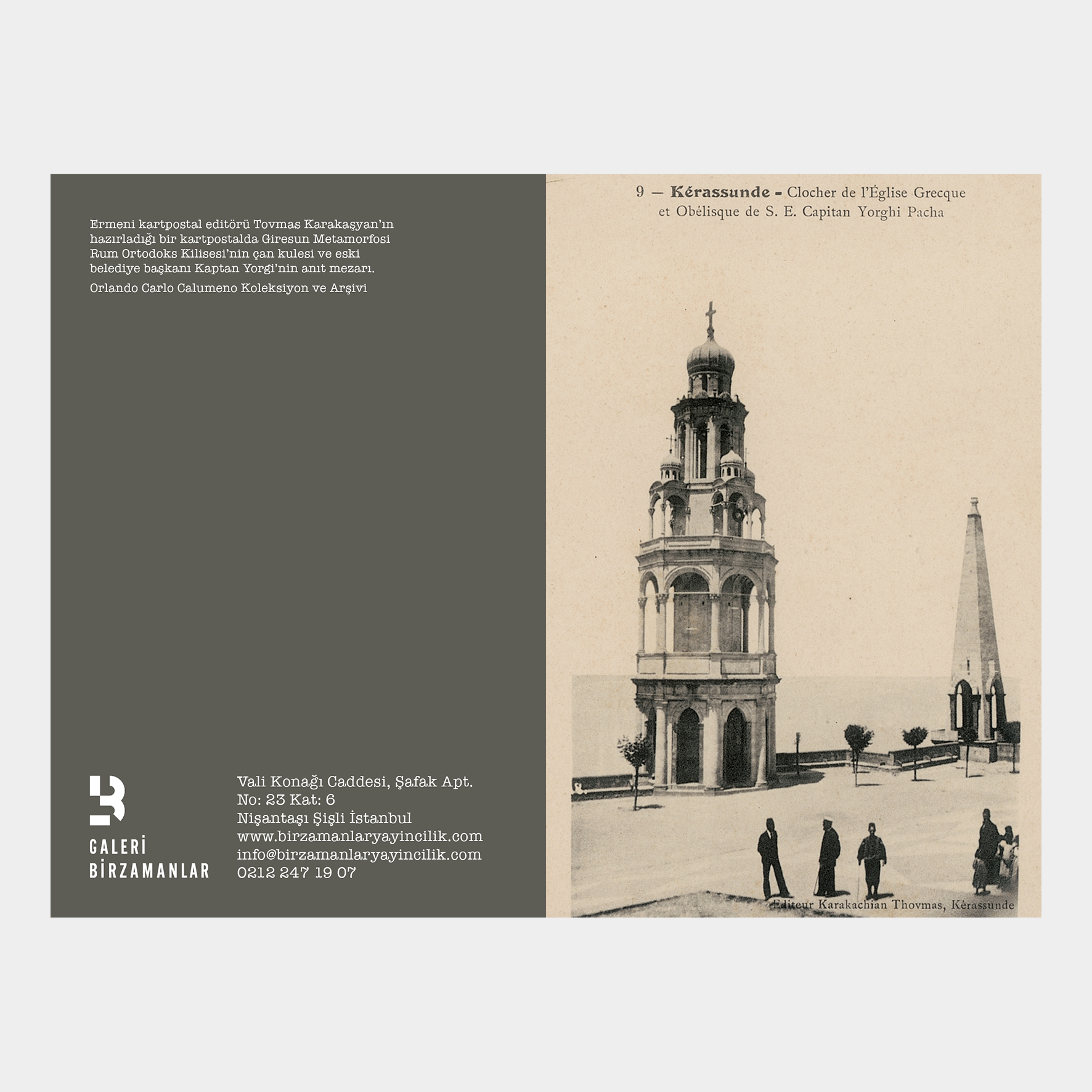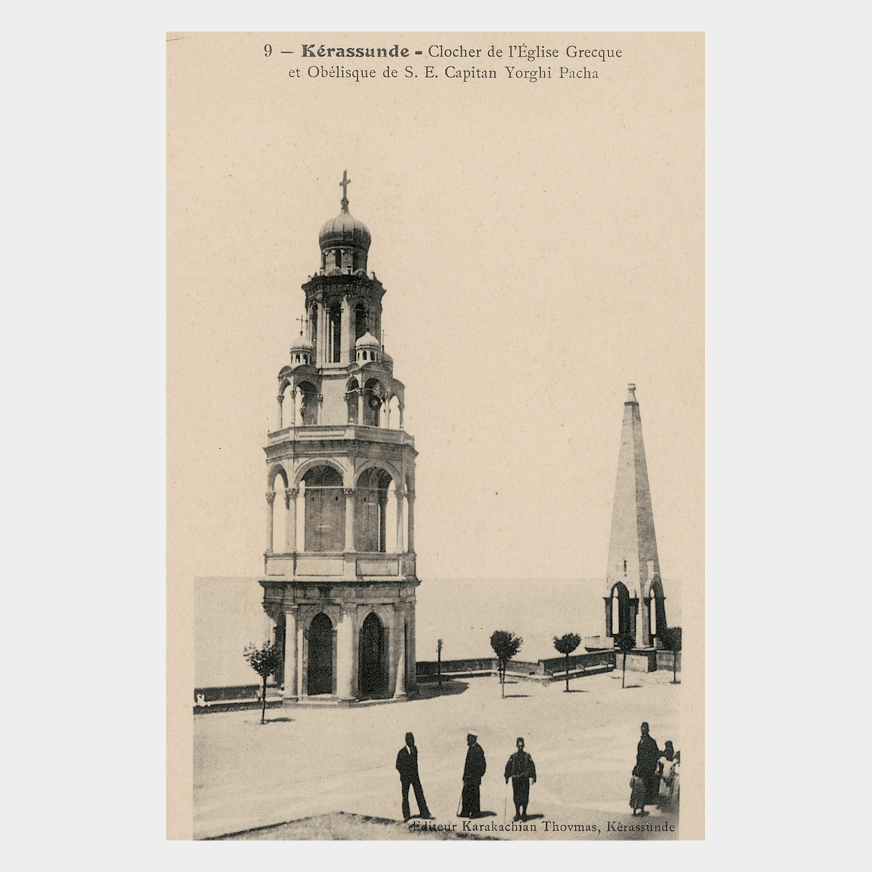 Ermeni kartpostal editörü Tovmas Karakaşyan’ın hazırladığı bir kartpostalda Giresun Metamorfosi Rum Ortodoks Kilisesi’nin çan kulesi ve eski belediye başkanı Kaptan Yorgi’nin anıt mezarı.